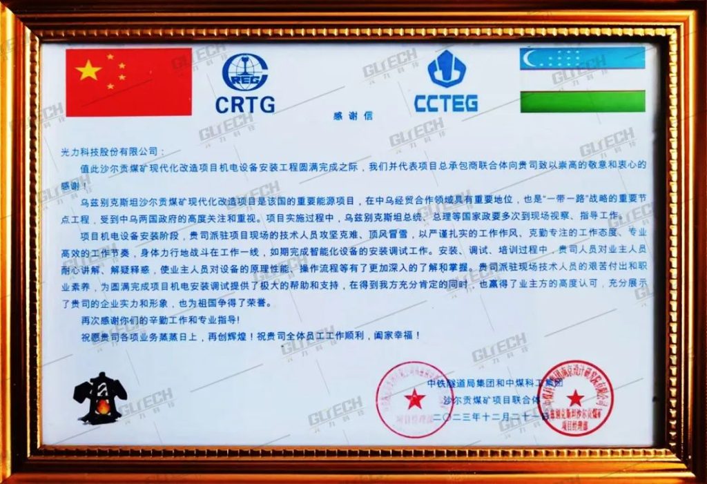 作為根植中國(guó)的本土企業(yè),光力科技積極參與烏茲別克斯坦煤礦智能化系統(tǒng)建設(shè),弘揚(yáng)”絲路精神”,響應(yīng)國(guó)家“一帶一路”政策,積極協(xié)辦中國(guó)-中亞安全能力提升研討會(huì),踐行“中國(guó)產(chǎn)品向中國(guó)品牌的轉(zhuǎn)變”,光力科技客戶成功團(tuán)隊(duì)秉承專業(yè)、熱情、主動(dòng)、高效的服務(wù)理念贏得了項(xiàng)目總承包商聯(lián)合體的認(rèn)可,并收到感謝信。